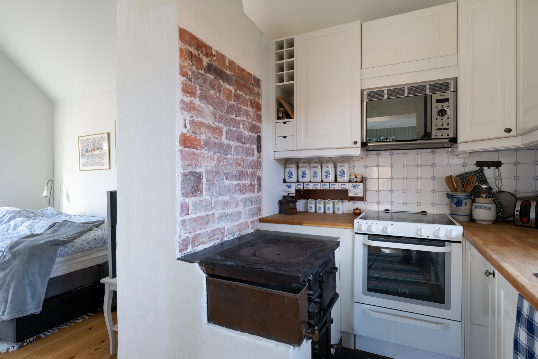 Direkt El. Solceller. Tillskottsvärme via kakelugn och vedspis.
